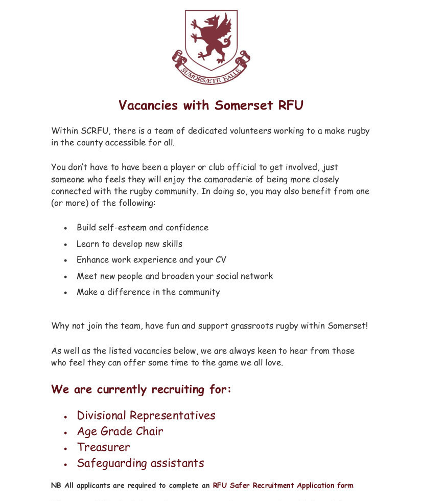 If you would like to join our team, please send an expression of interest by email to Caroline Holt (caroline.holt@somersetrfu.co.uk) to discuss potential opportunities.